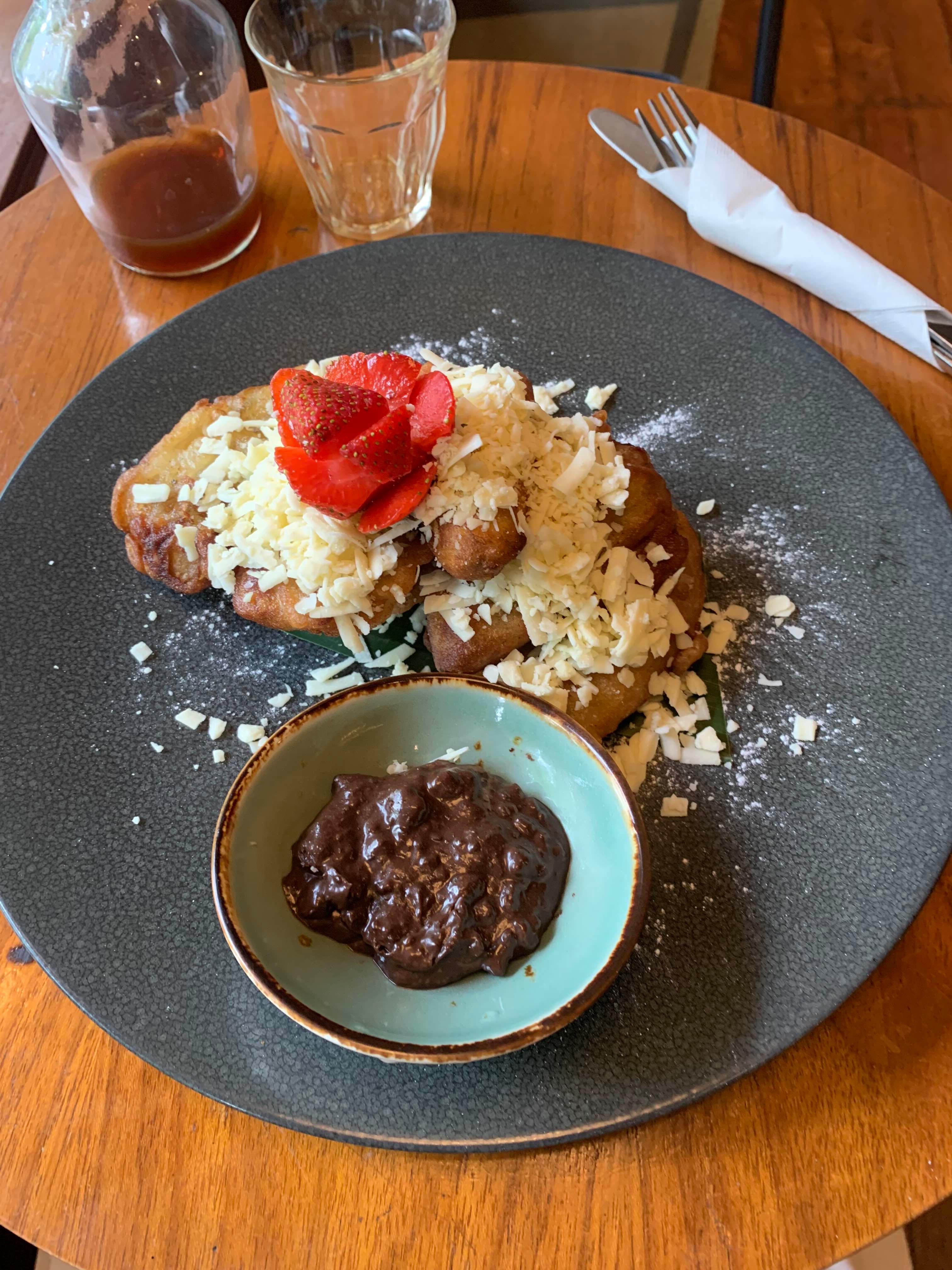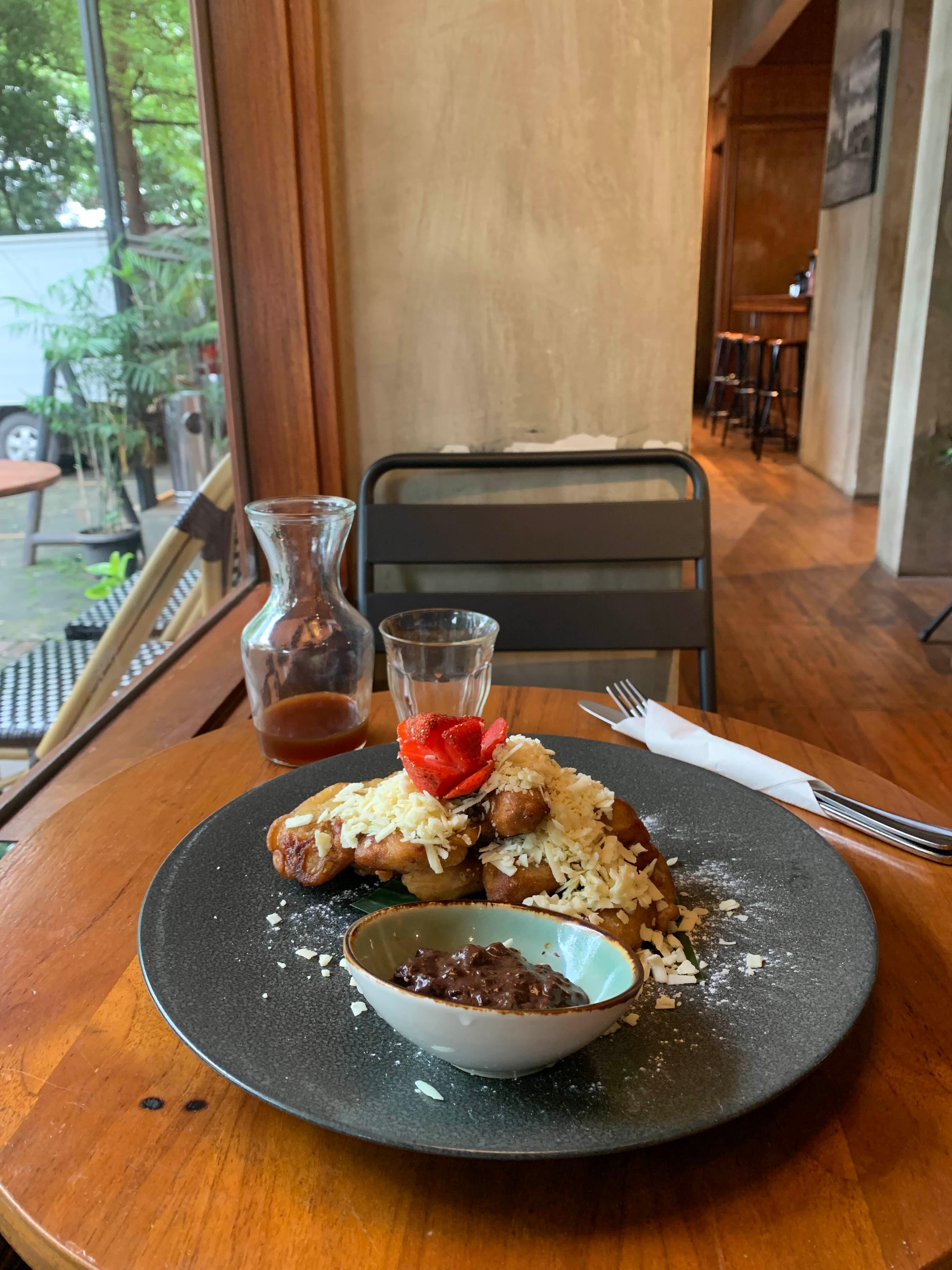 그렇게 한참을 있다 배고파져서 피상고랭(바나나튀김)을 주문했다. 끄망 물가 대비 저렴한 편이었는데 양이 꽤 많았다. 자카르타에 2년 넘게 살면서 정말 다양한 피상고랭을 시도해 봤는데 그 기준 엄청 맛있지도 맛없지도 않는 일반적인 맛이었다. 피상고랭 종류는 하나 뿐이었는데 치즈랑 초코크런치소스를 같이 줘서 좋았다.