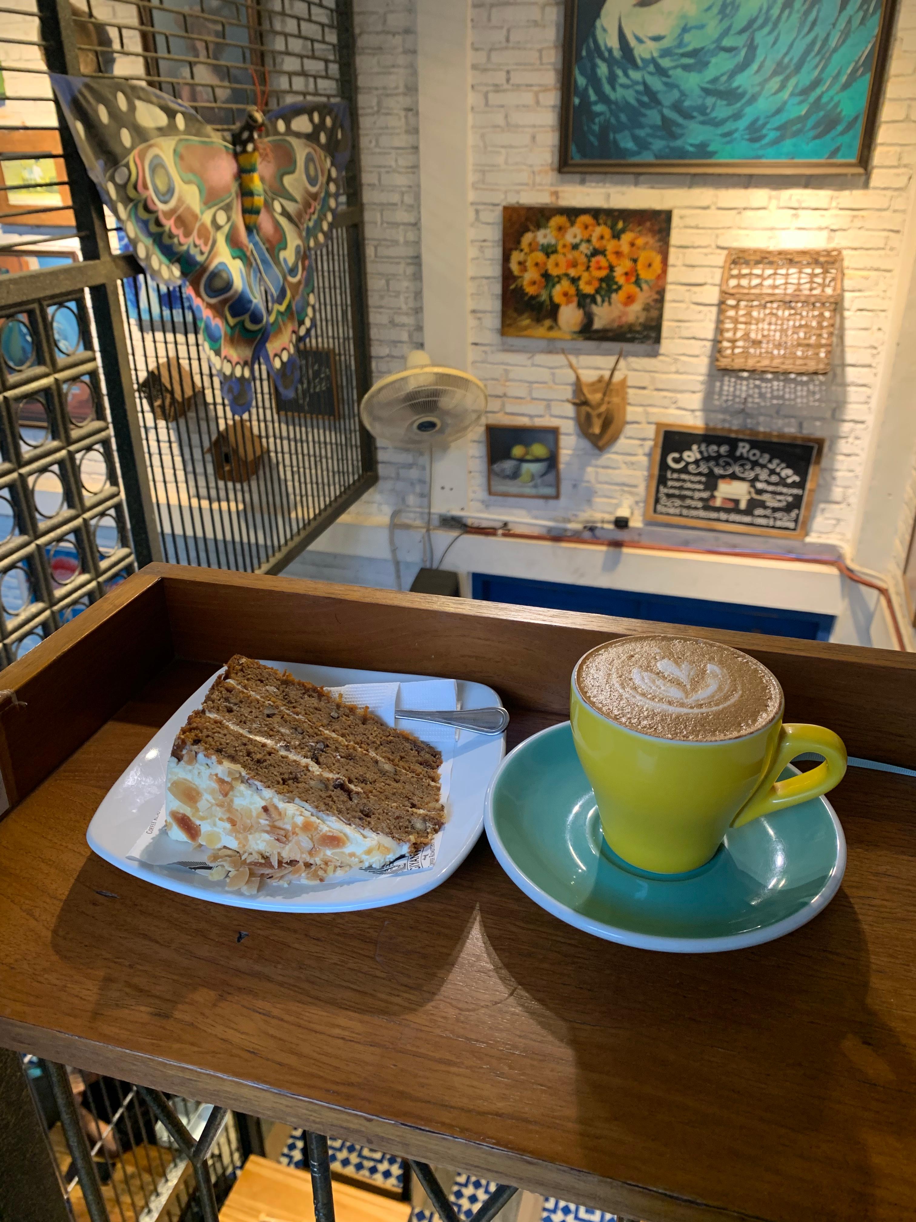 이 카페의 대표 메뉴라는 홈메이드 당근케이크랑 따뜻한 카푸치노 한 잔을 주문했다. 주문할 때 일반으로 할지, 진하게 할지 물어보는데 나는 일반으로 주문했고, 일반임에도 맛이 진했다. 에스프레소가 기본으로 투 샷은 들어가는 것 같다. 사실 이렇게 커피 색깔만 봐도 진해보이긴 한다.
