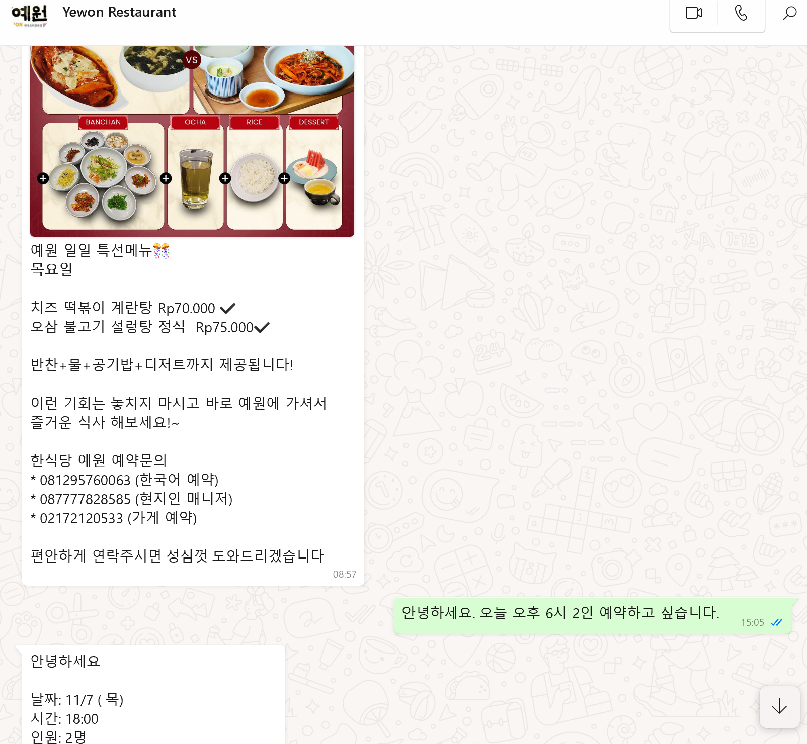 미리 예약하고 가면 좋은데 이렇게 왓츠앱으로 한국어로 예약할 수 있어서 너무 편하다. 실제로 직원들중에 한국어 가능한 직원분들이 몇 분 계셔서 의사소통하기도 너무 편하다.