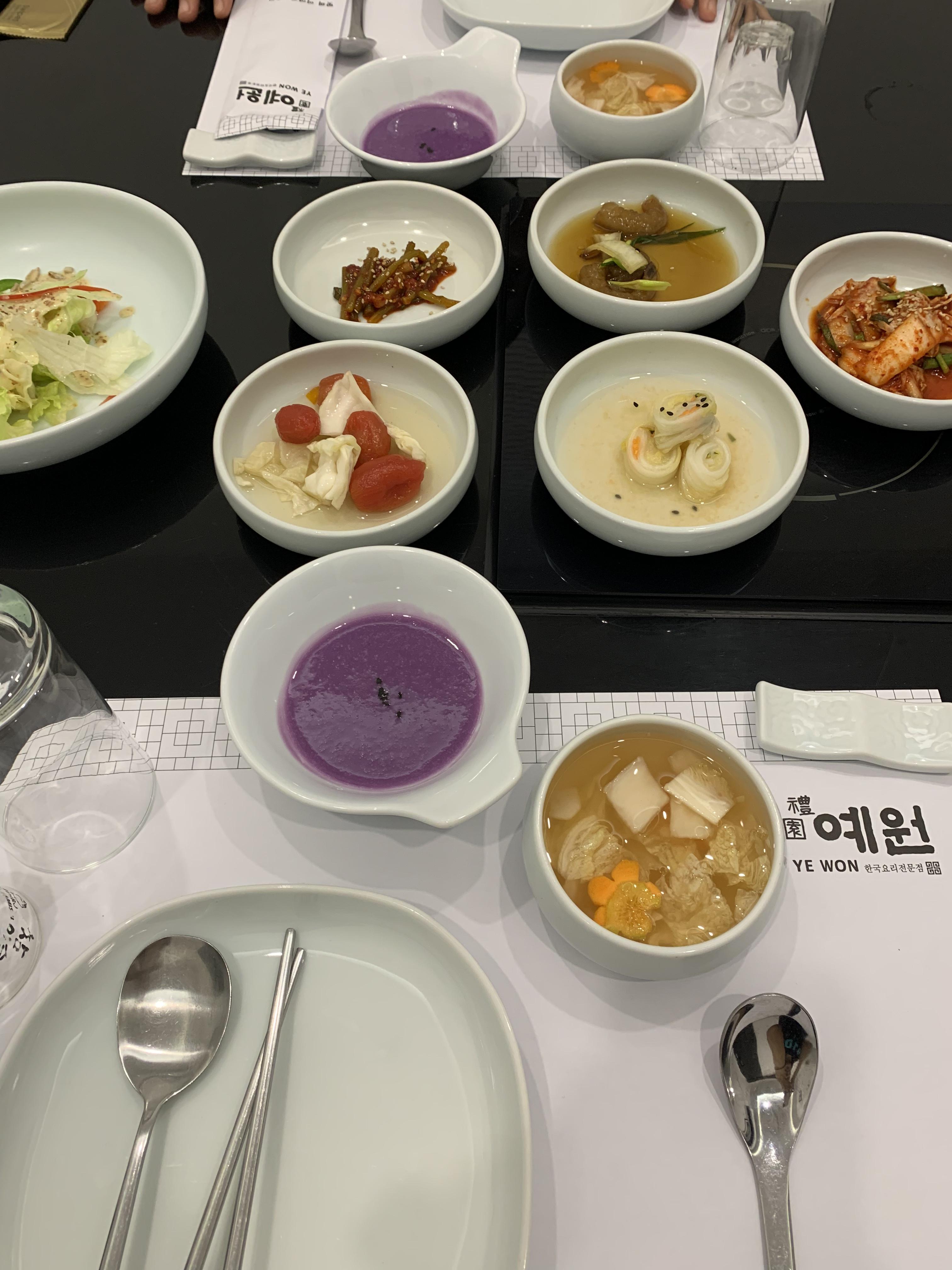애피타이저로 먼저 고구마스프를 주는데 진짜 별미이다. 본격적으로 식사하기 전 속을 따뜻하게 달래준다. 여기에 보이는 것과 같이 새우장에 다른 곳에서 보기 힘든 고구마순 무침, 백김치랑 방울토마토 피클까지 나온다. 여기 김치도 항상 겉절이로 나와서 신선하고 너무 맛있다. 저 동치미도 보이게도 너무 좋고 한국에서 먹는 맛 그대로이다.