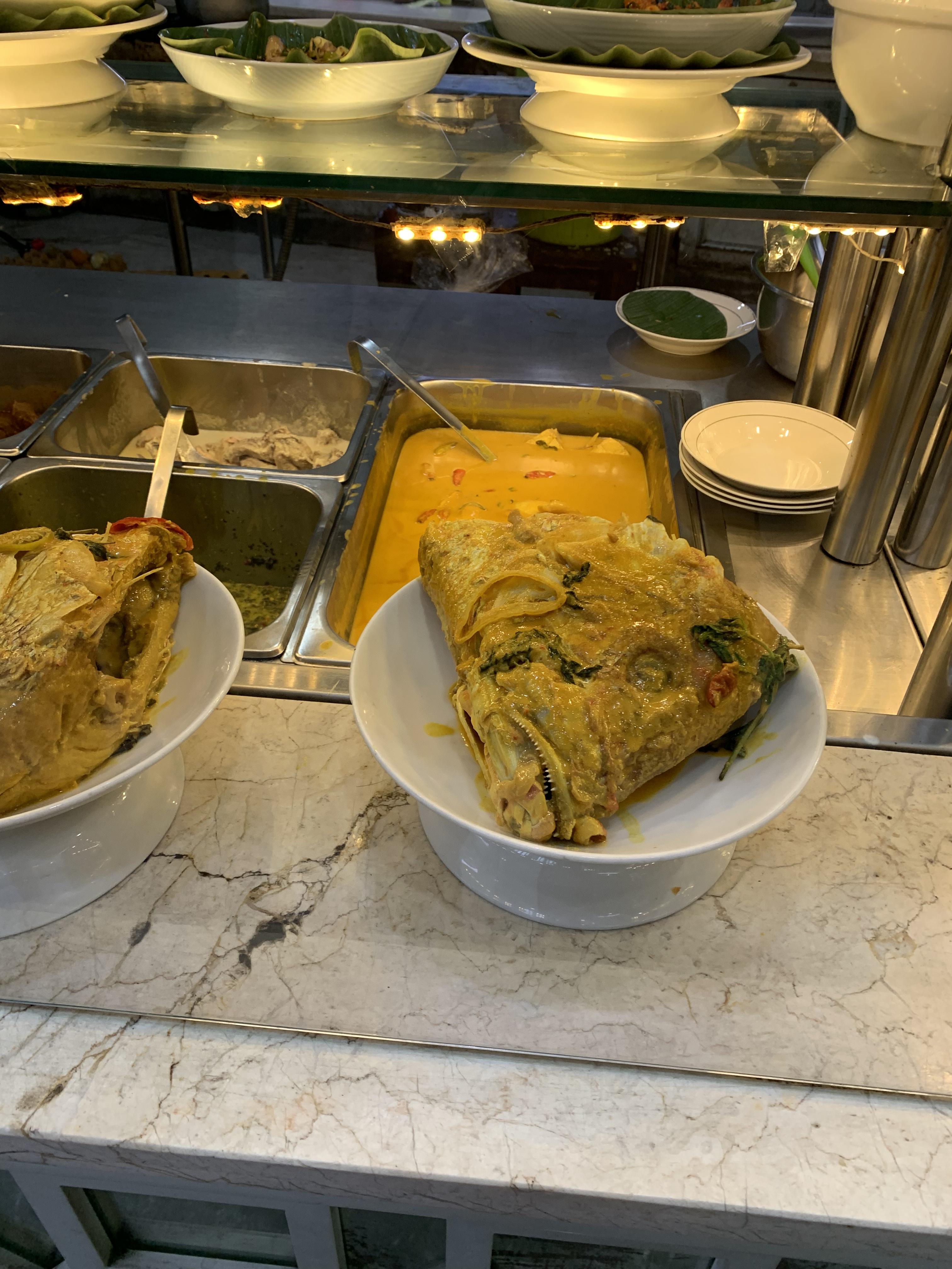 무슨 생선인지 모르겠으나 엄청 큰 생선 머리가 그릇에 담겨 있는게 신기해서 찍어봤다. 저 노란색은 커리가 들어간 나시 빠당 특유의 소스로 짭짤한 커리맛이 난다. 약간의 향신료 향도 나서 역시나 인도네시아 음식 초심자들은 거부 반응이 있을 수 있으나 동남아 특유의 향신료 맛 좋아하시는 분들이라면 무리 없이 시도해 볼만 하다.