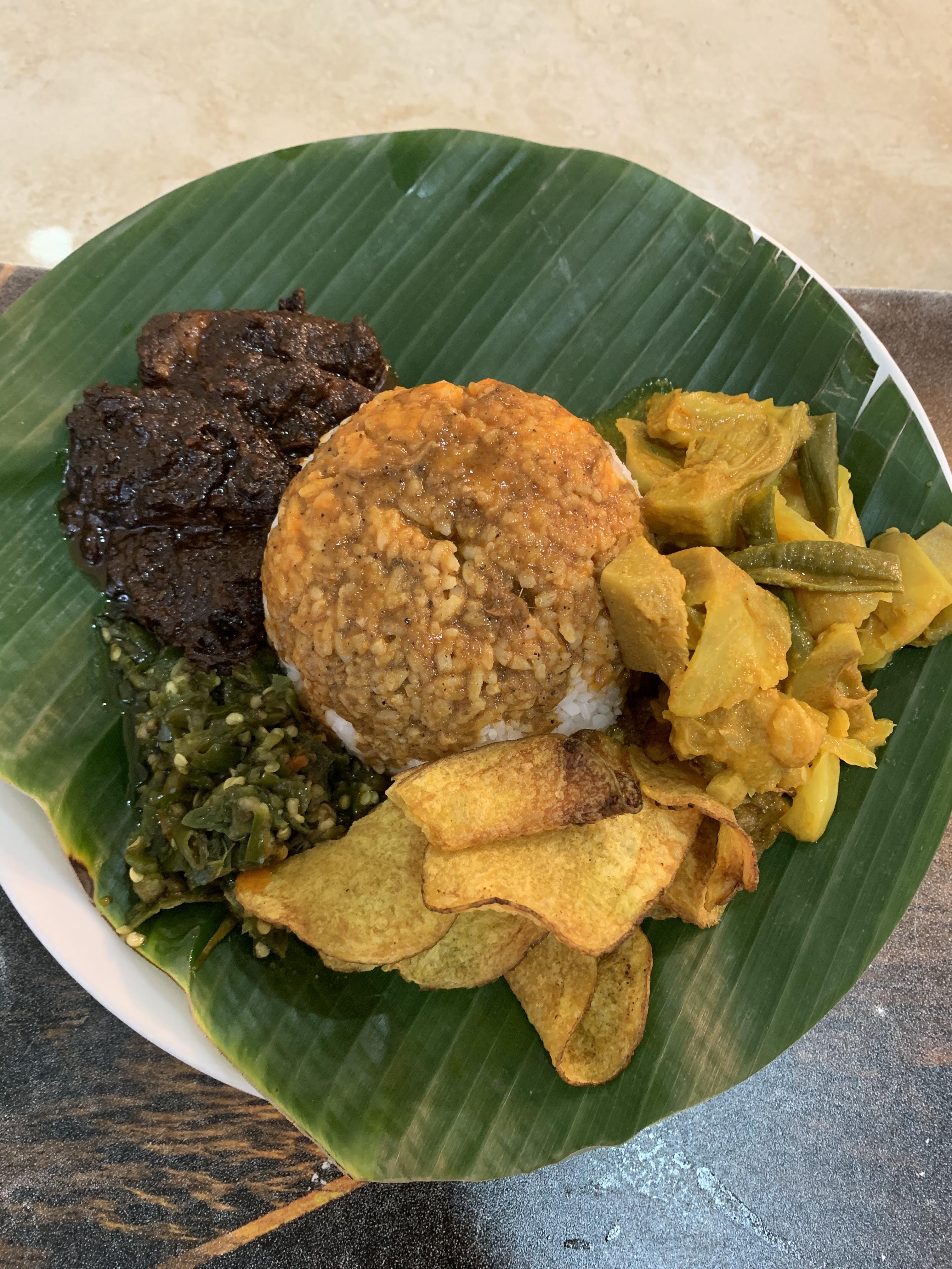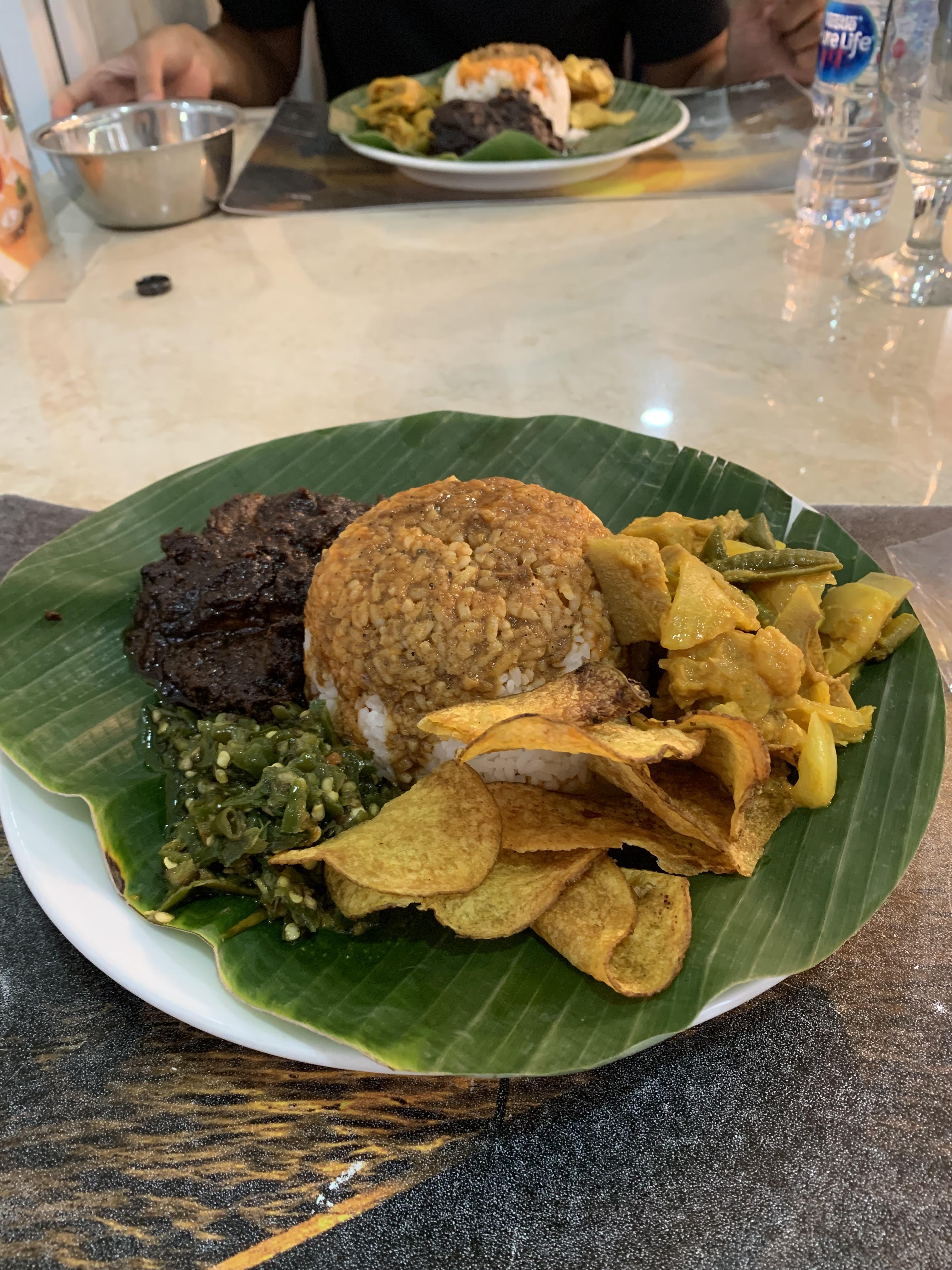 빠기쏘레는 빠당 음식점이지만 단품으로도 주문이 가능하다. 이날은 단품으로 Nasi Rames Rendang (나시 라메스 른당)을 주문해봤다. 집에서 나시빠당 배달음식으로 주문할 때 많이 시키는 메뉴인데 식당에서 주문한 건 처음이었다. 나시빠당은 또 특징이 밥양이 고봉밥 수준이다. 나시 라메스는 밥에 날마다 달라지는 기본 사이드 디쉬들을 같이 서빙해주는 메뉴이다. 이날은 끈땅고렝(감자튀김이라고 부르나 감자칩), 파파야커리, 차베이조(아주 매운 인도네시아 고추)가 같이 나왔다. 여기서 우리가 시킨 메뉴는 나시 라메스 른당으로 메인 메뉴로 른당이 같이 나온다. 른당은 세계에서 가장 맛있는 음식 1위도 기록했던 인도네시아 방문시 꼭 먹어봐야할 음식 1위이다. 한국 장조림과 갈비의 중간 맛인데 사실 한국인 입맛엔 한국 갈비가 월등히 더 맛있다. 그래도 인도네시아에서 른당 잘하는 집에 가면 정말 맛있는 른당을 먹어볼 수 있으니 른당은 꼭 검색해서 잘하는 집으로 가서 시도하길 추천한다. 빠기쏘레 른당은 지점 바이 지점이긴 한데 대체로 맛있는 편이다.