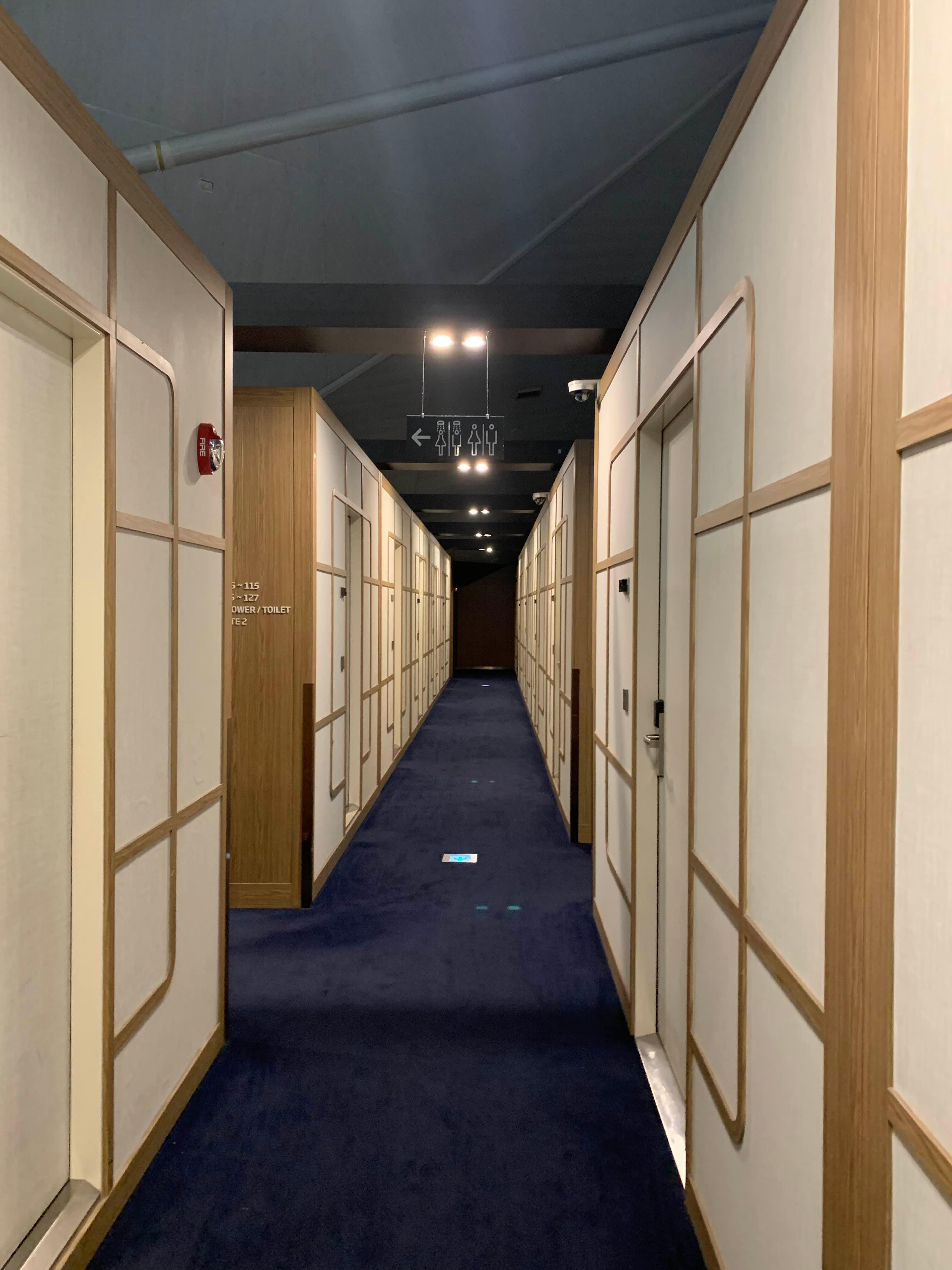 방 크기가 생각보다 많이 작진 않았다. 전에 싱가폴에서 정말 침대만 있는 캡슐호텔에서 자 본 적이 있는데 거기에 비하면 여기는 캡슐이라기 보단 작은 일본 호텔 느낌이었다.