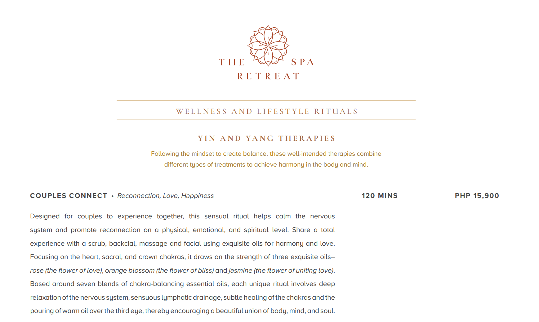먼저 우리가 예약한 마사지는 커플 커넥트로 두시간 동안 진행되는 마사지였고, 가격은 2인에 15,900 필리핀 페소로 한국돈 40만원 살짝 넘는 금액이었다. 예약은 스파 홈페이지에 적힌 메일로 했고, 먼저 선금 50%를 지불하고 잔금은 스파에 도착해서 마사지 받기 전에 지불했다.
