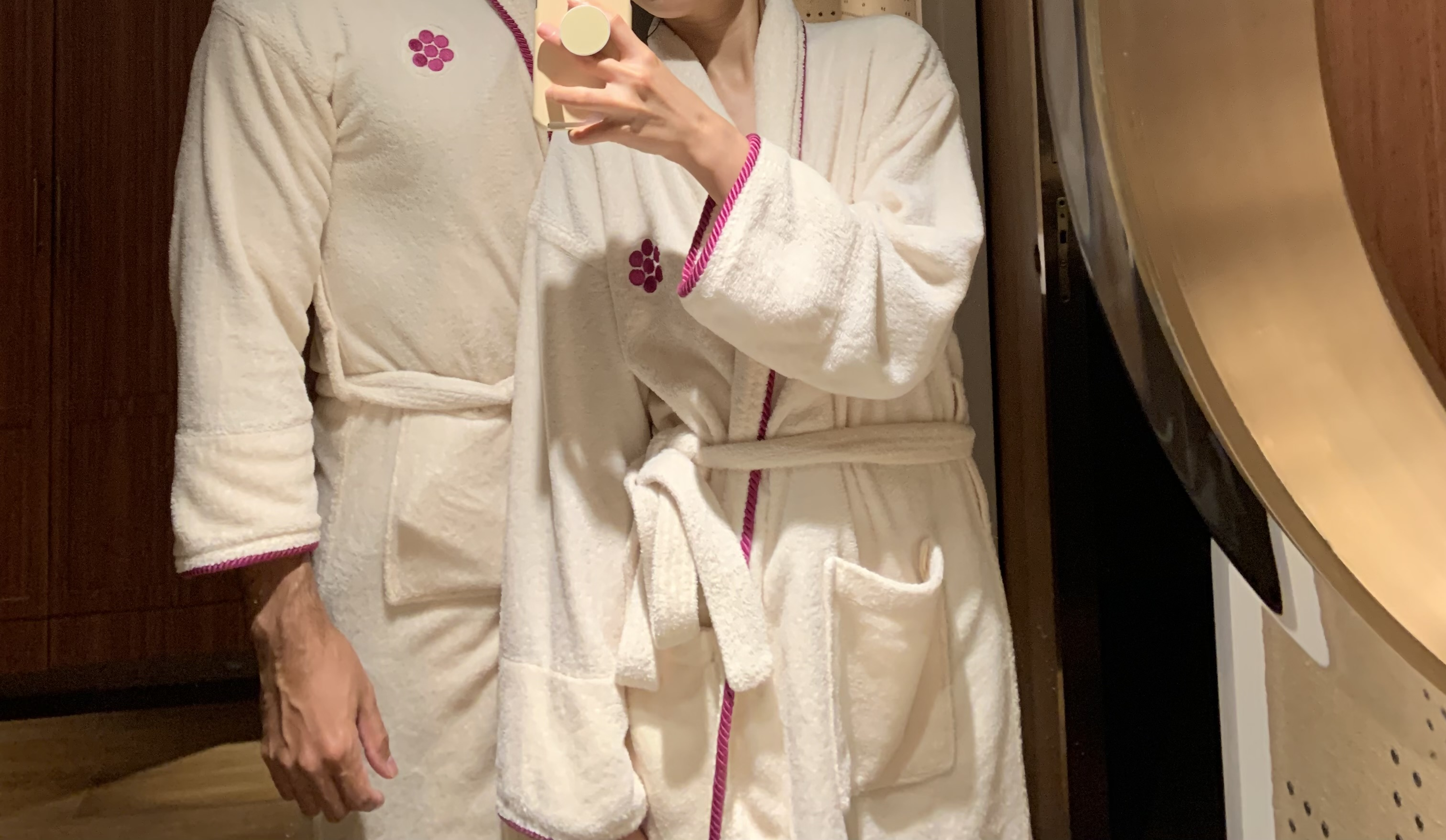 내부 부대시설인 찜질방, 사우나는 사진 촬영이 금지라 촬영을 하진 못했다. 마사지 받는 곳에서 남자친구와 사진을 찍어봤다. 저 가운이 여태 호텔에서 입어 본 가운 중에 제일 보들보들하고 마치 누가 나를 안아주는 기분이었다. 브랜드 찾아서 꼭 사고 싶은데 호텔에서 단체로 주문제작 한거라 내가 구매할 수 있을지 모르겠다.