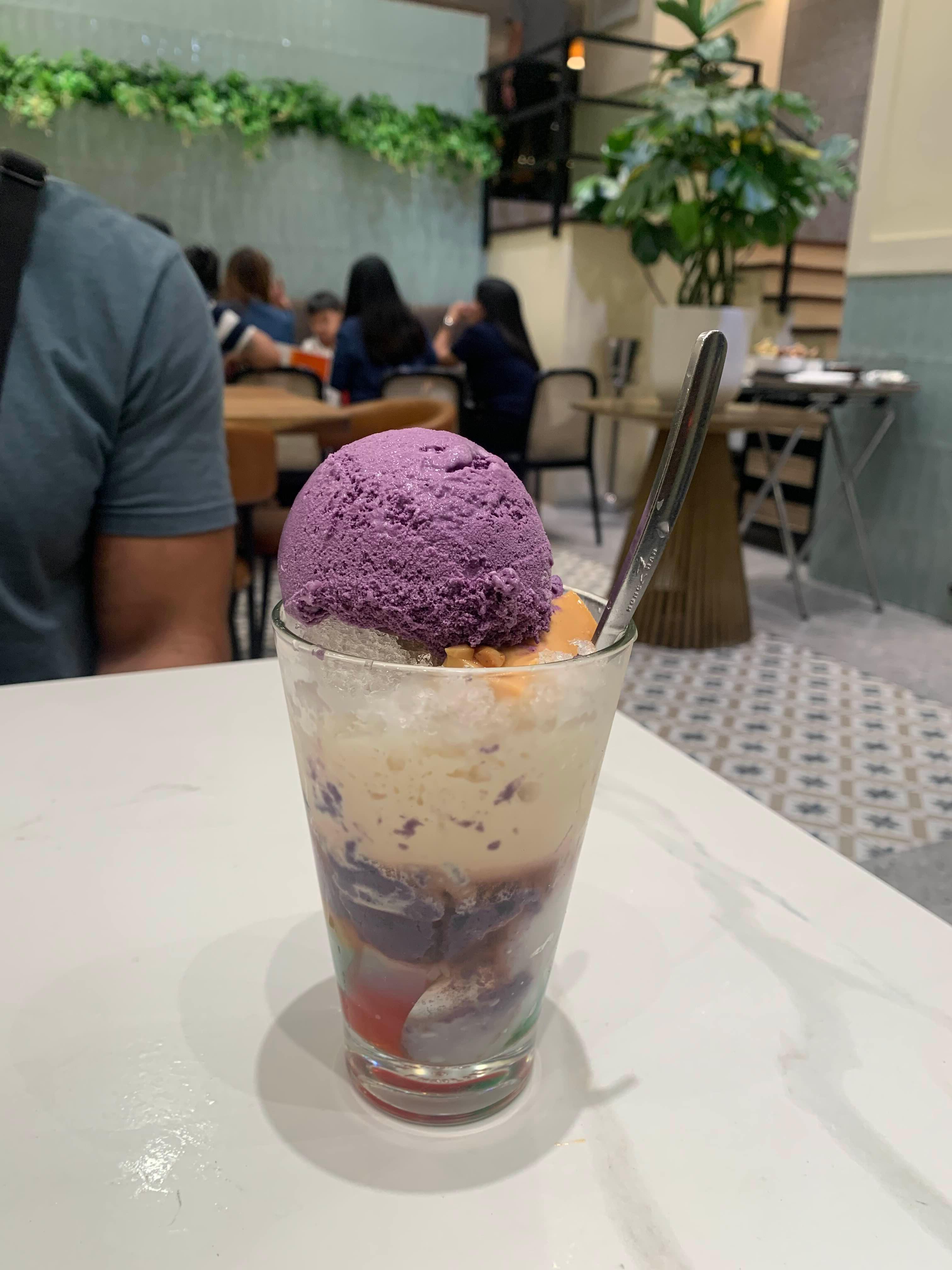 돼지고기에 갈릭라이스까지 먹고 나니까 너무 배불렀는데 여기까지 왔는데 디저트를 안 먹을 순 없었다. 그래서 필리핀 디저트 중에 제일 먹고 싶었던 할로할로를 주문했다. 한국에 살 땐 잘 몰랐는데 한국만 빙수가 있는게 아니었다. 주로 더운 나라인 동남아시아에는 각 국가만의 빙수가 있는 것 같다. 먼저 인도네시아에는 에스짬뿌르부터 다양한 인도네시아식 빙수가 있다. 필리핀의 이 할로할로도 필리핀식 빙수 같은건데 저 위에 올라가 있는 우비 아이스크림이 일단 너무 진하고 맛있었고, 속에 들어있는 달콤한 젤리나 과일들이 간 얼음과 어우러져서 너무 맛있게 먹었다. 속이 너무 느끼했어서 시원한 빙수를 먹으니까 속도 딱 정리돼고 마무리가 좋았던 것 같다. 이상으로 필리핀 마닐라 전통음식 맛집 타타티토 소개를 마친다.