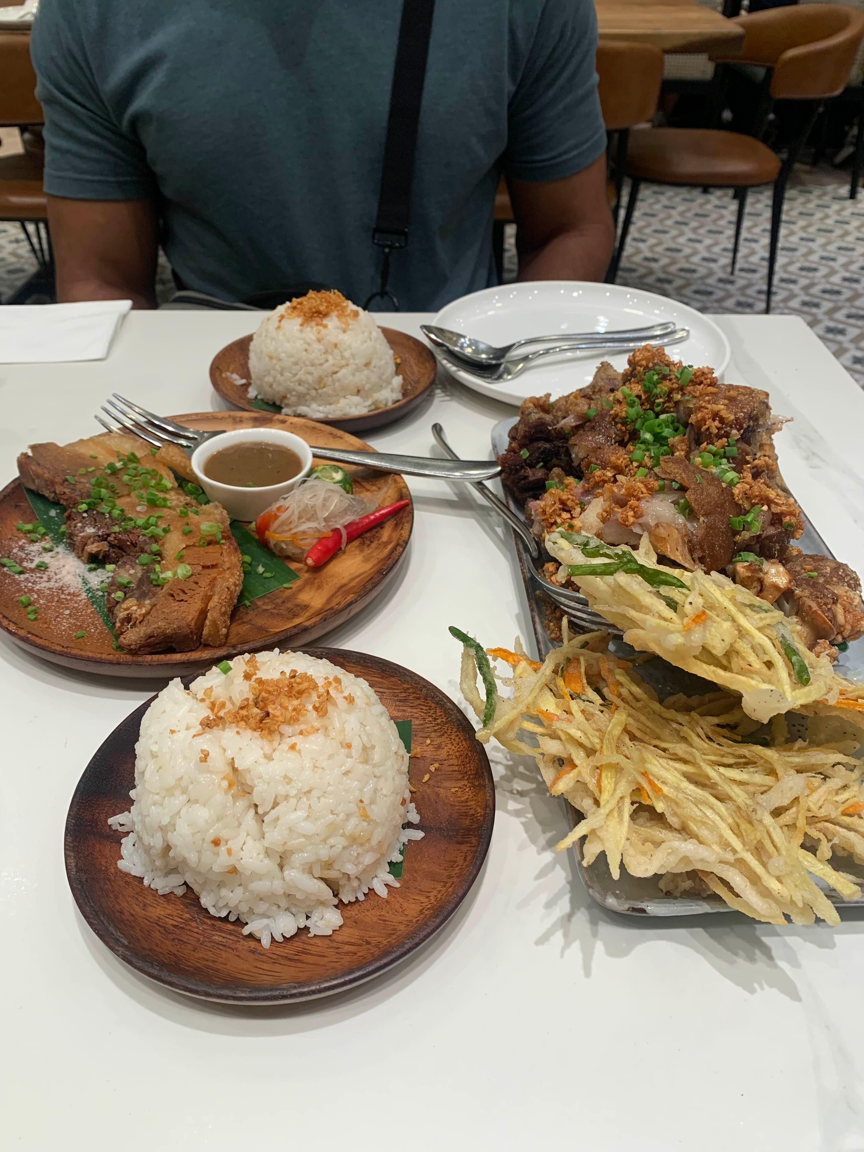 먼저 레촌과 크리스피 파타를 시켰다. 레촌은 삼겹살을 튀긴 음식 같았고, 크리스피 파타는 족발을 튀긴 것 같았다. 크리스피 파타는 한 포션이 2인분이라 양이 많다. 여기에 감자채 튀김 같은 게 같이 나왔다. 밥은 포함돼 있지 않아서 갈릭라이스 두 개도 따로 주문했다. 결론은 우리 둘이서 양이 너무 많았고, 튀긴 것만 주문해서 뼛속까지 한국인인 나는 너무 느끼하고 먹기가 힘들었다. 김치가 절실했고, 피클이라도 주면 좋겠다고 생각했는데 밑반찬 같은 건 따로 없었다. 그래서 레촌에 함께 딸려나온 아주 매웠던 고추랑 무 피클 같은 걸로 속을 다스리면서 먹었다.