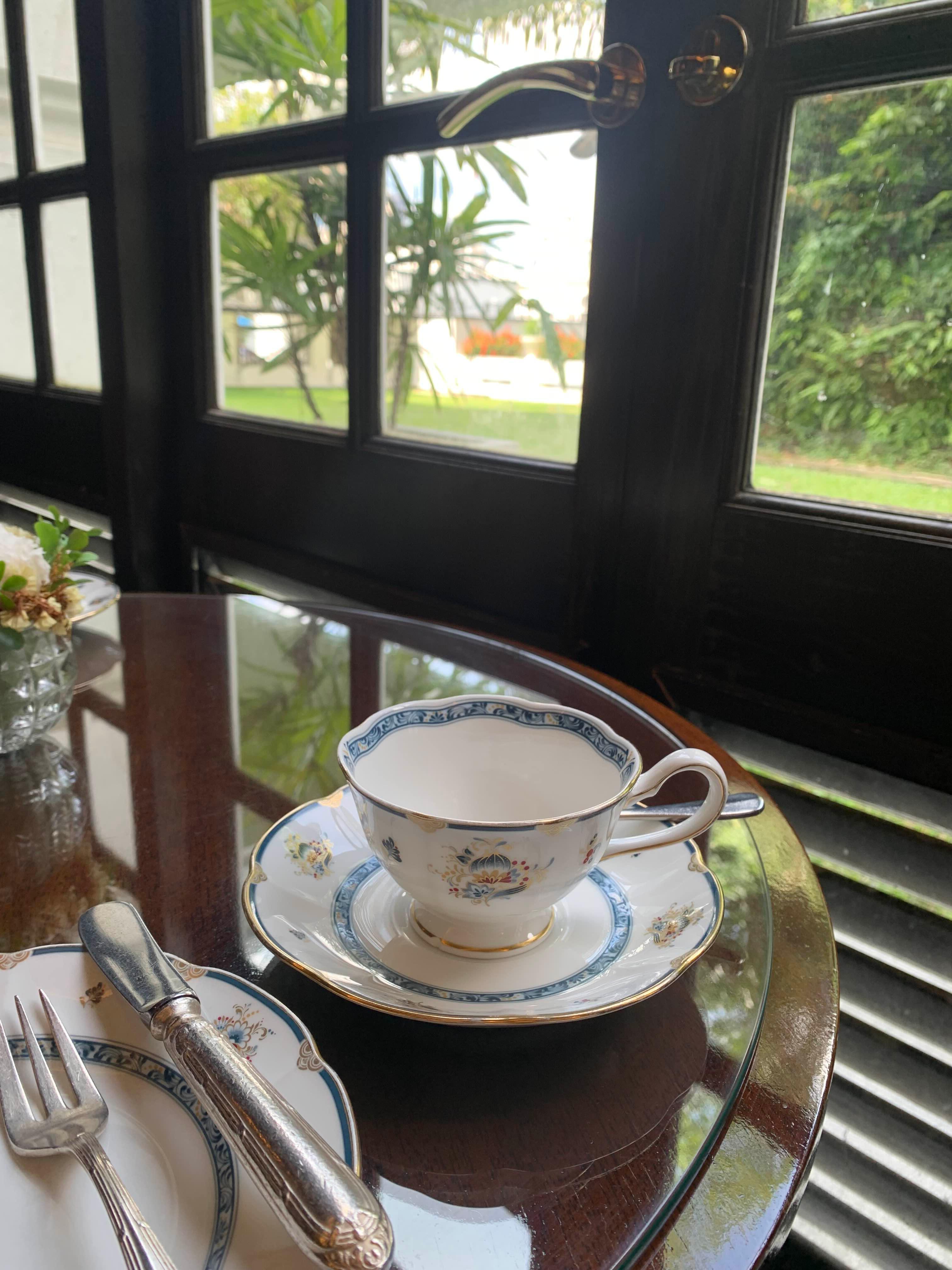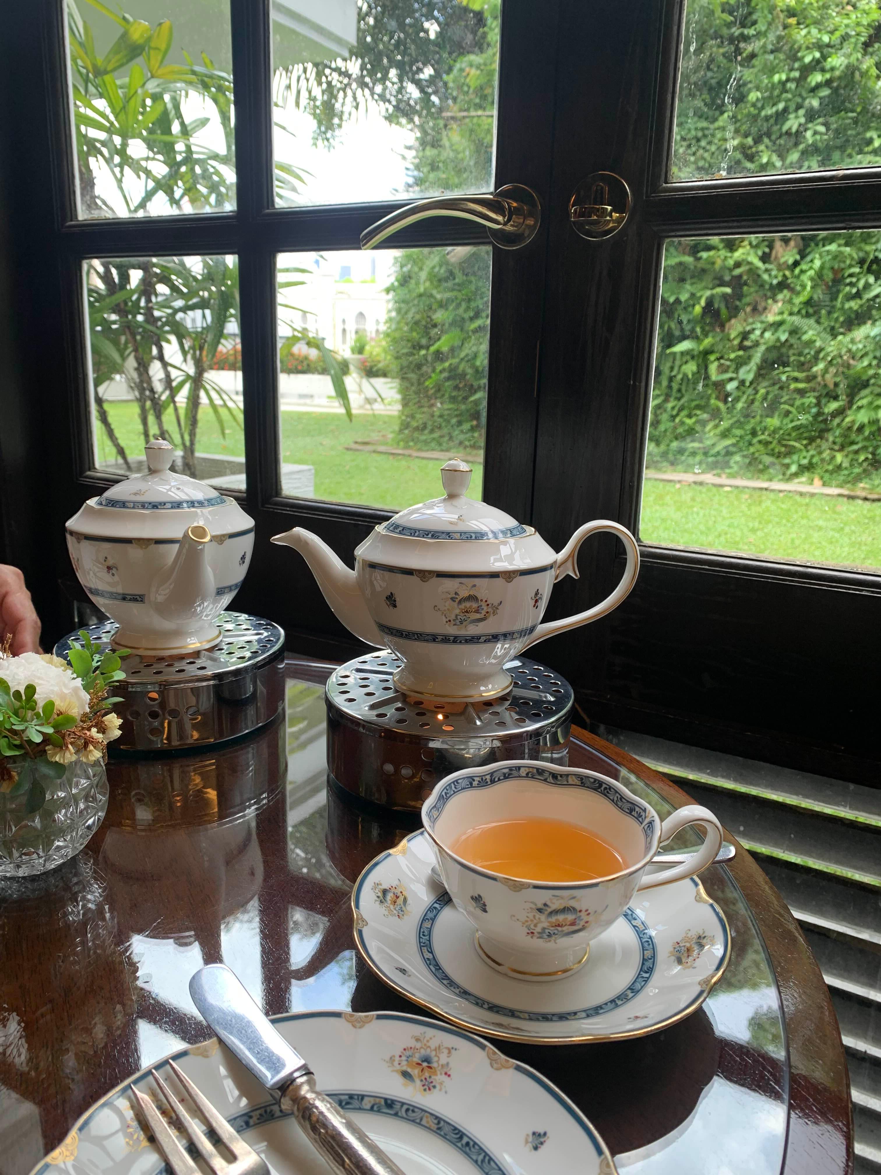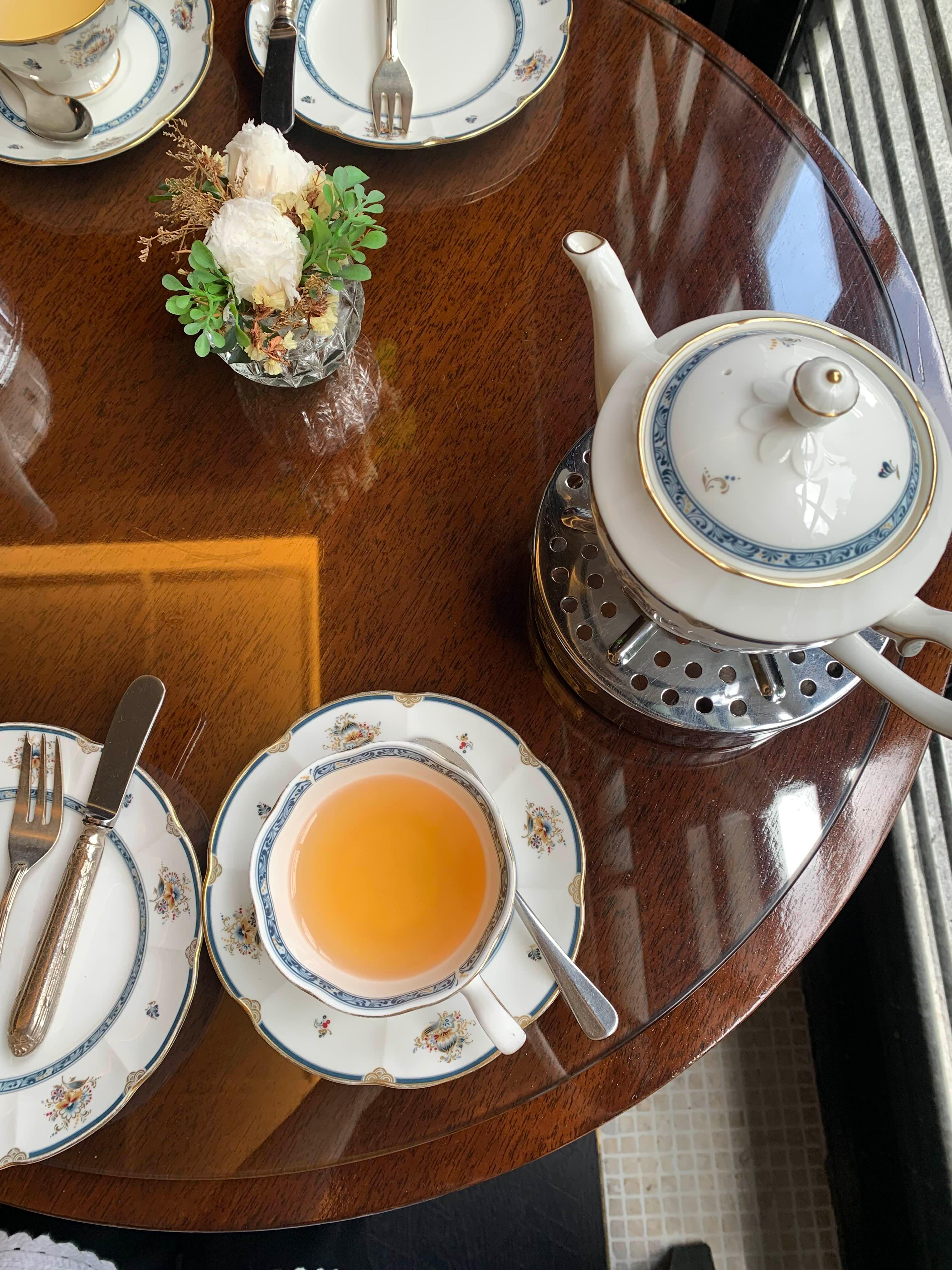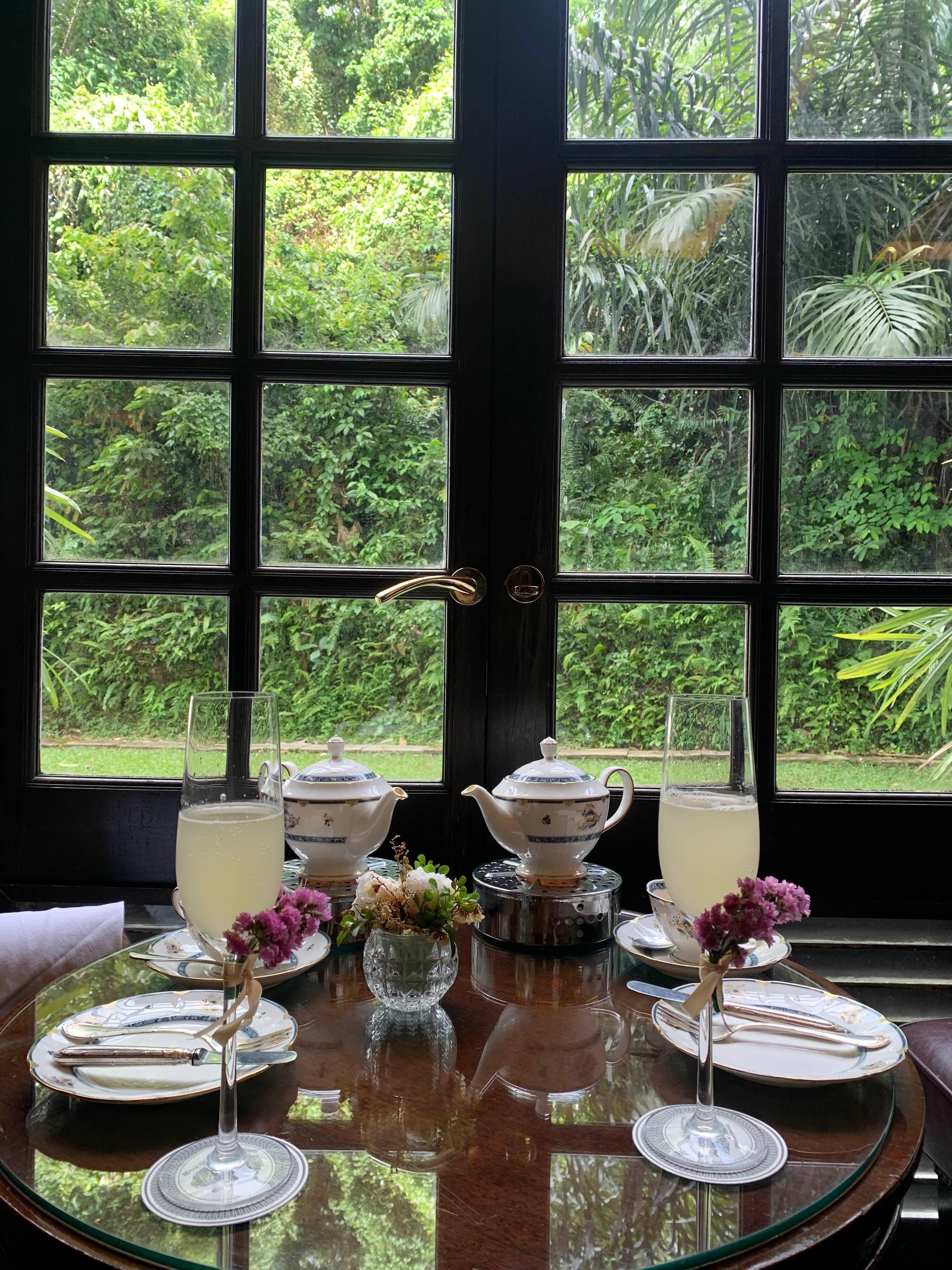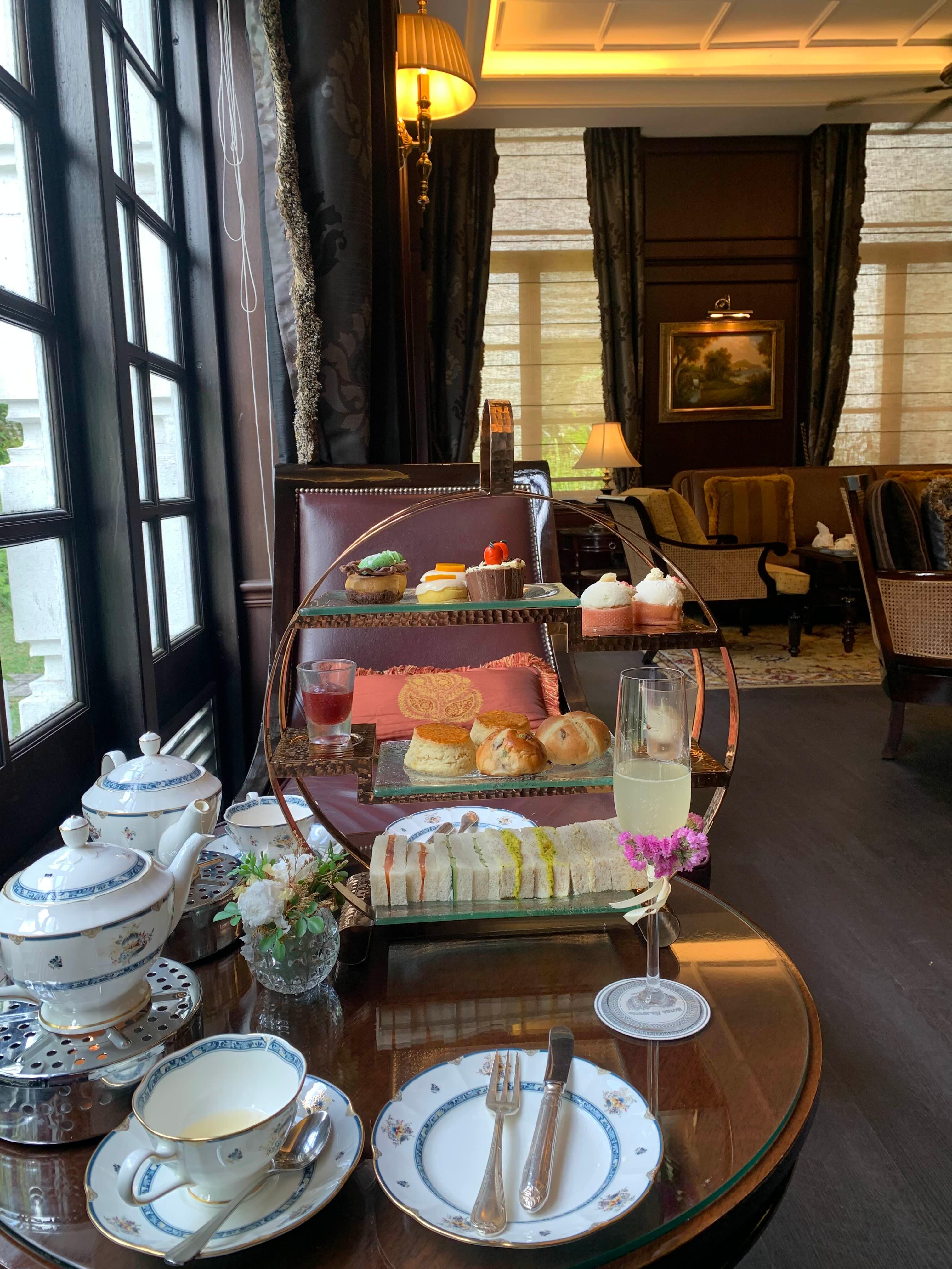 이렇게 샴페인 잔에 리프레셔 티도 제공됐다. 창가 옆에 보이는 초록초록한 뷰와 아름다운 찻잔들, 맛있는 티와 함께 해서 너무 행복한 시간이었다.
