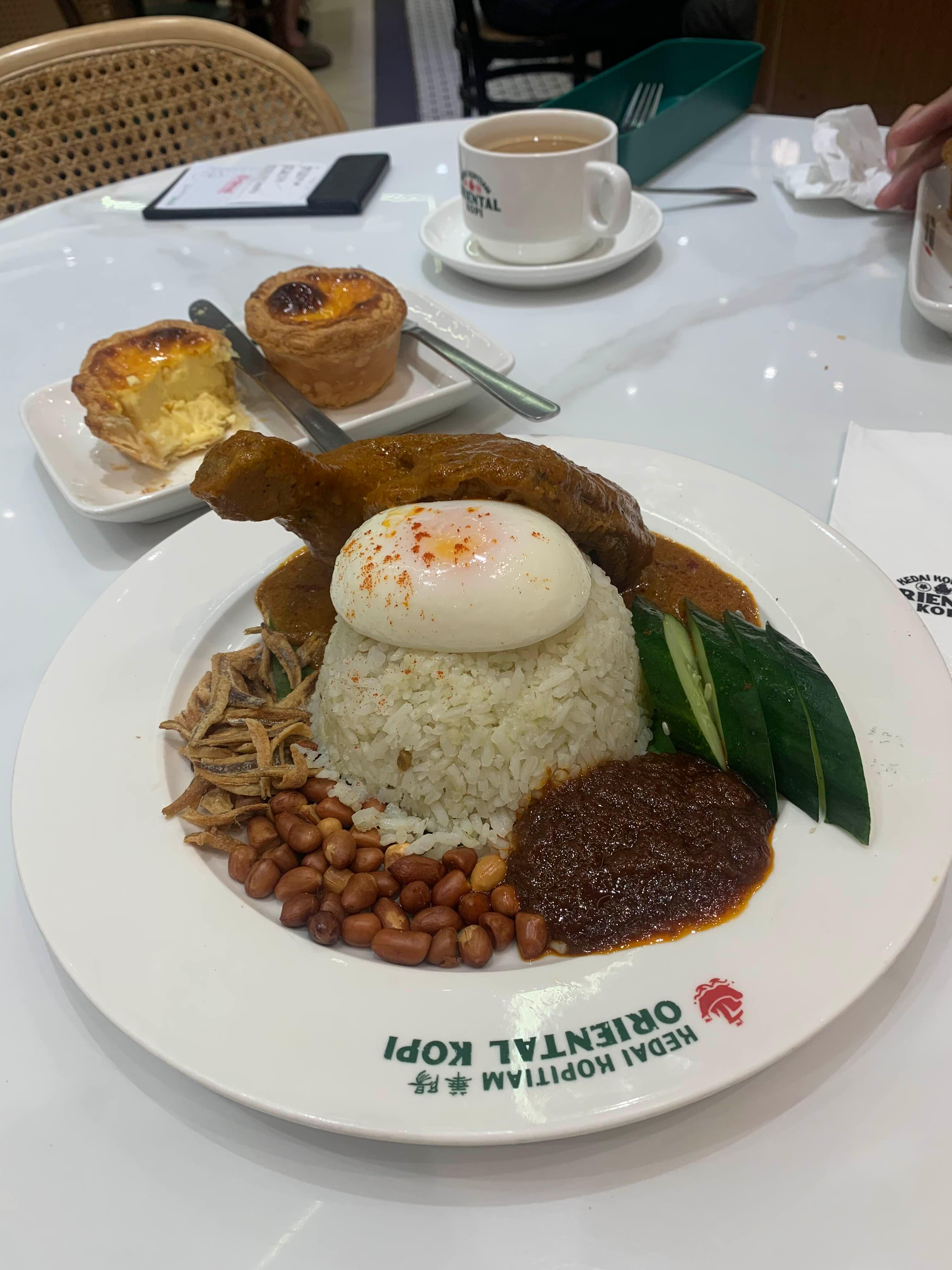 그래서 여행 마지막날 다시 왔다. 점심 먹으러 온거라 나는 말레이시아 대표 음식인 나시르막을 주문했는데 남자친구는 화이트커피랑 에그타르타만 4개를 주문했다. 그만큼 에그타르트가 너무 맛있었다. 나시르막도 치킨이 아주 실하고 맛있게 먹었다.